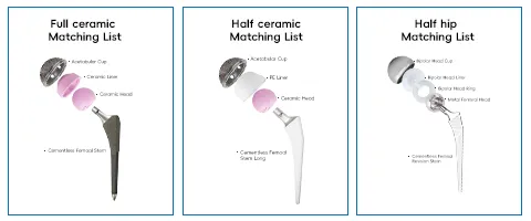 Clear matching lists define which models of femoral heads, stems, and cups can be safely combined for maximum safety.